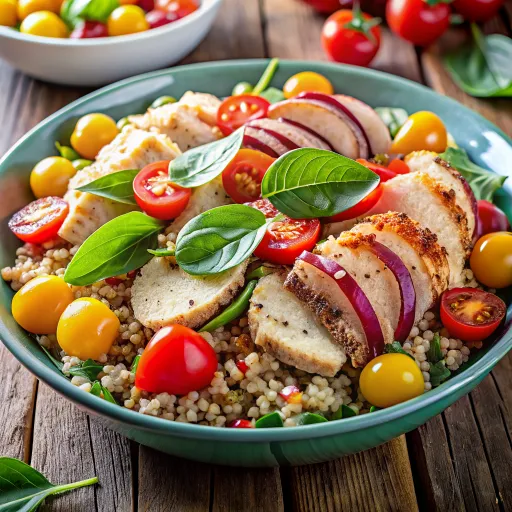 Experience a delightful blend of creamy avocados, crisp seasonal vegetables, and nutty quinoa, topped with a zesty lime dressing for a refreshing and balanced meal.
